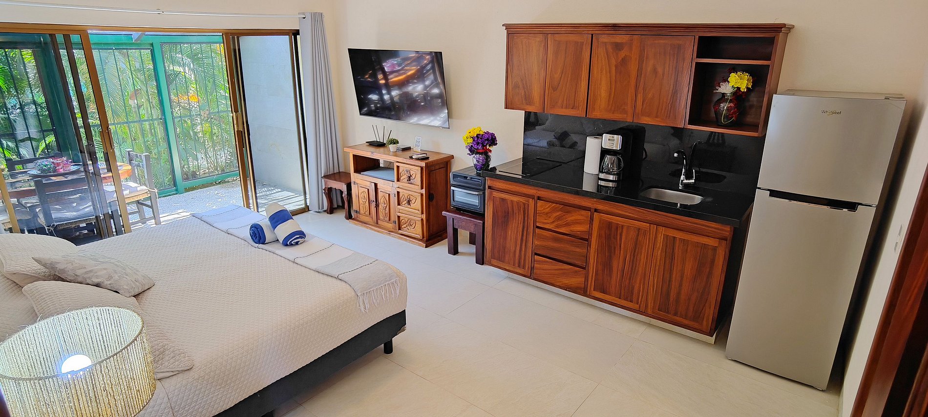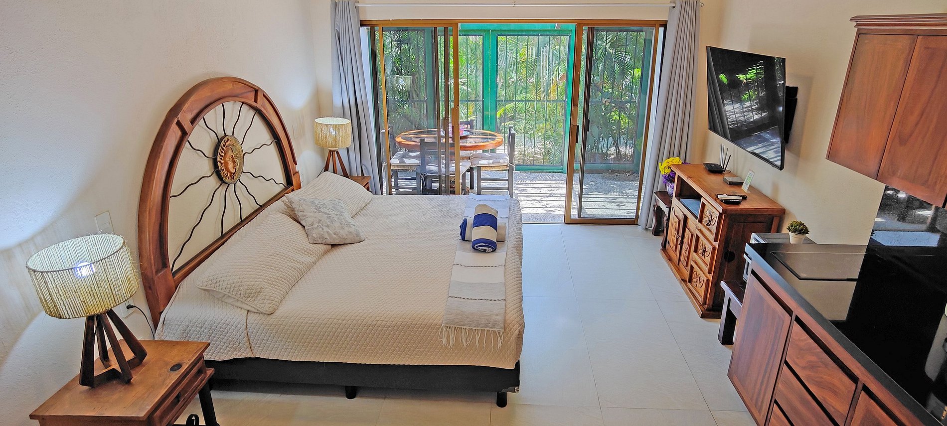 Discover the perfect harmony between tradition and modernity in our Mexican-style studio. With spacious green areas, internet, television, induction stoves, air conditioning, and a recreation area with a pool table. Moreover, we are Pet-friendly! Welcome to a space where comfort and warmth blend to create your ideal home. We do not only provide a cozy home but also the option to host your special celebrations. We offer event services for weddings or other occasions in our beautiful green spaces.