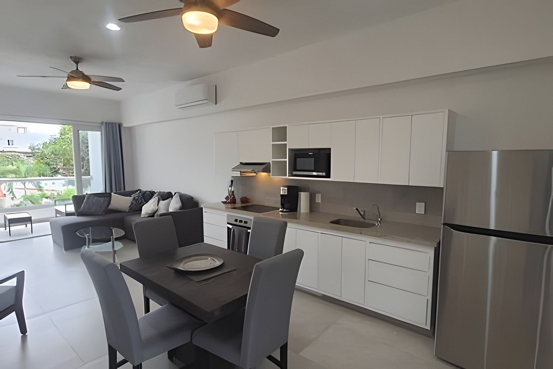 Acogedor departamento de una recámara con cama King Size, cocina completa, comedor, baño y medio, clóset, cuarto de lavado con lava-secadora, dos balcones, uno con vistas a la alberca y el otro con vistas a la calle.