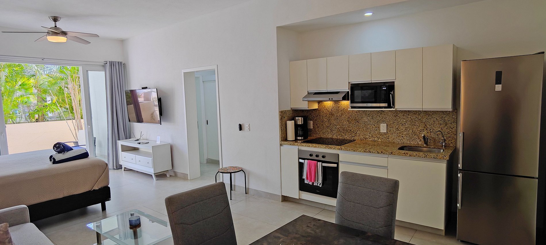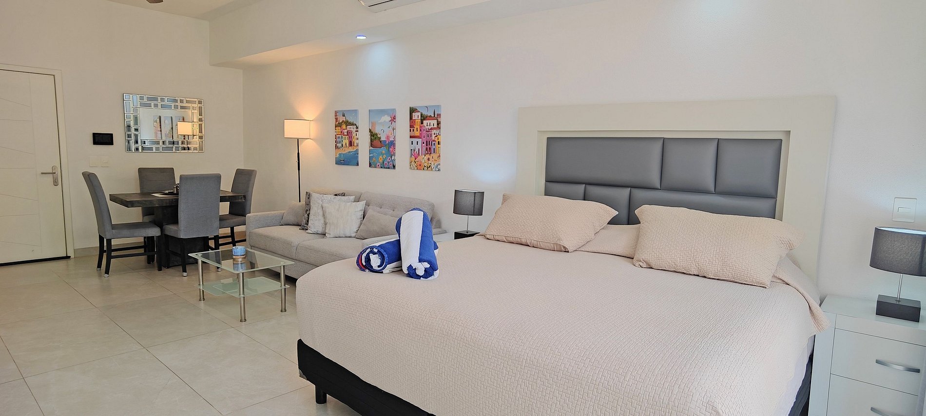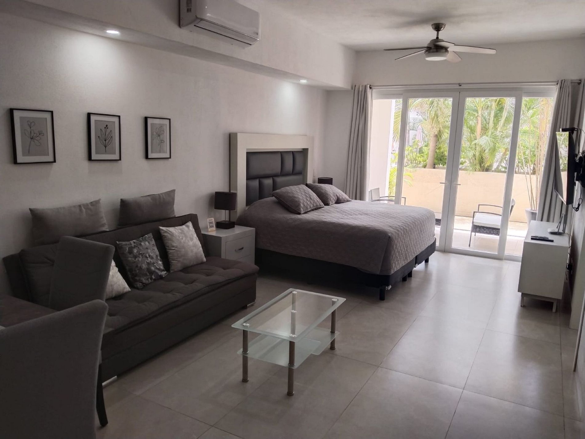 Acogedor estudio con una cama Queen Size, un sofá cama, cocina de tamaño completo, comedor, un baño completo, clóset, cuarto de lavado con lava-secadora, y balcón con vistas a la alberca.