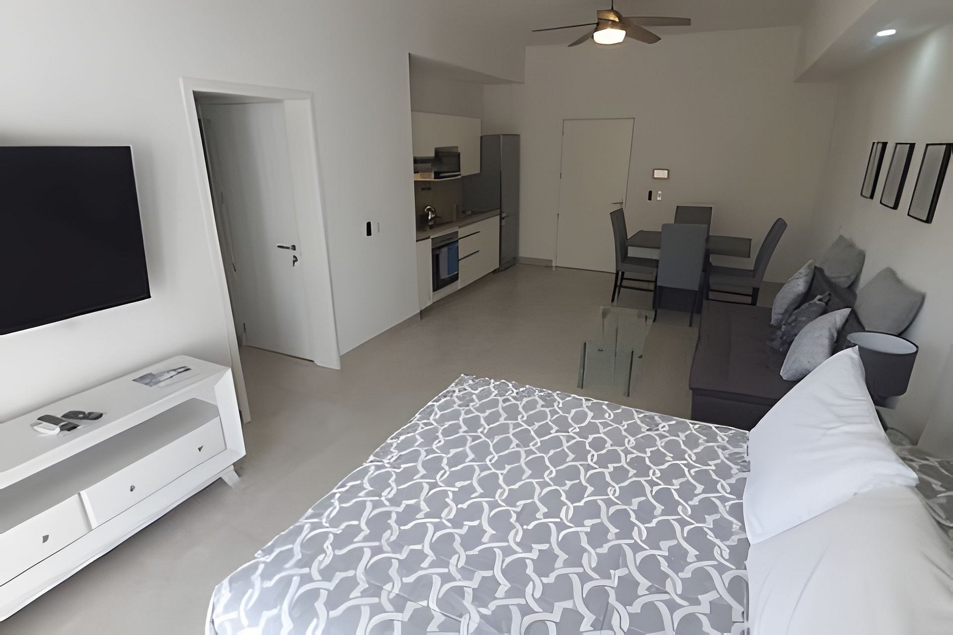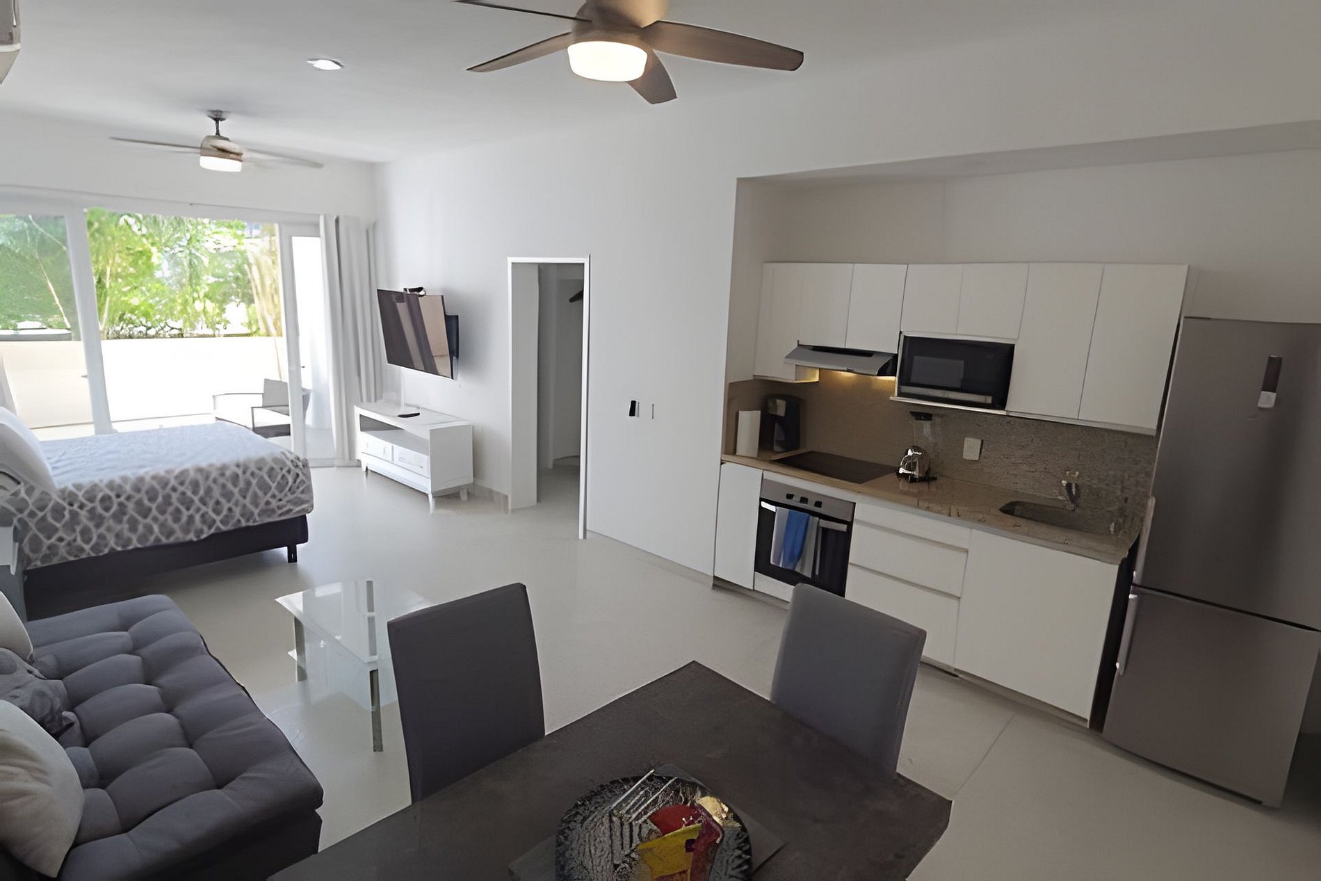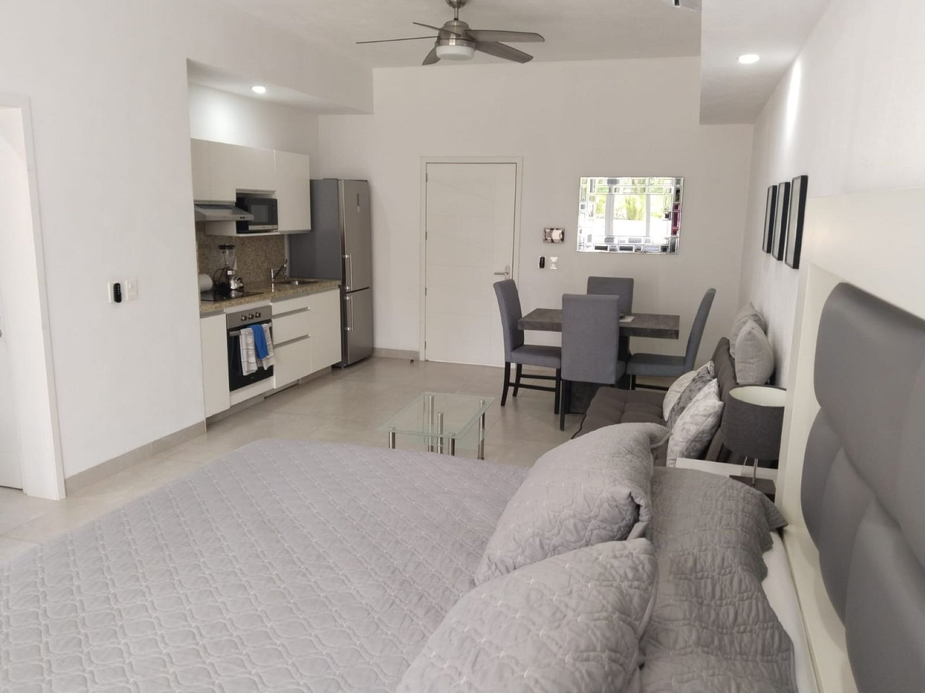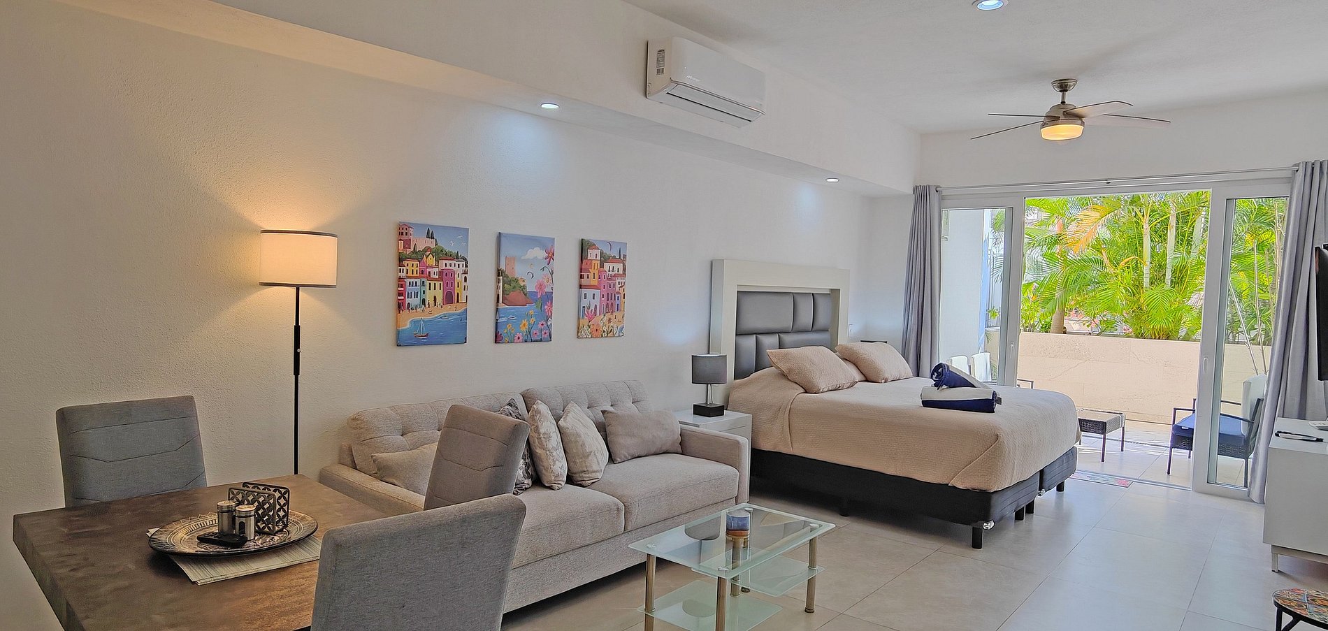 Acogedor estudio con una cama Queen Size, un sofá cama, cocina de tamaño completo, comedor, un baño completo, clóset, cuarto de lavado con lava-secadora, y balcón con vistas a la alberca.