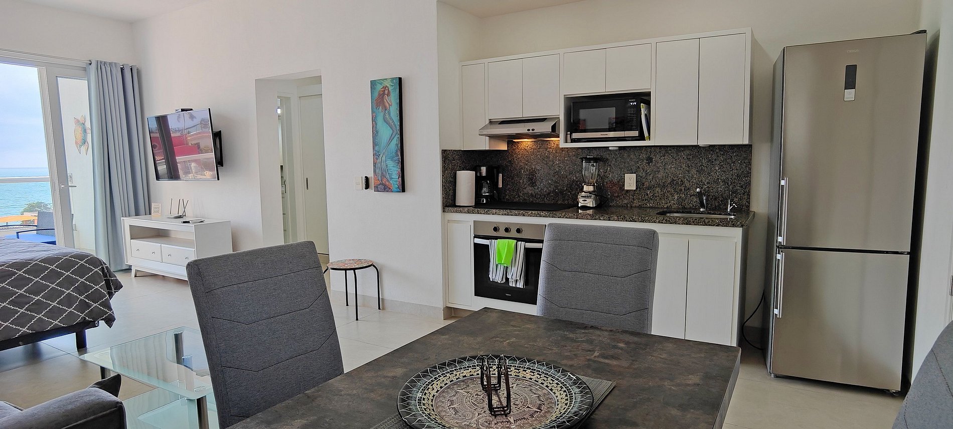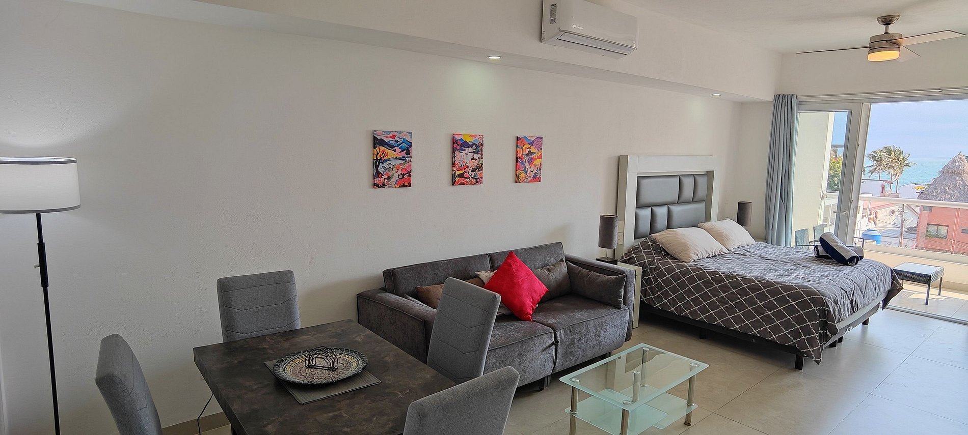 Acogedor estudio con una cama King Size, un sofá cama, cocina de tamaño completo, comedor, un baño completo, clóset, cuarto de lavado con lava-secadora, y balcón con vistas a la playa.