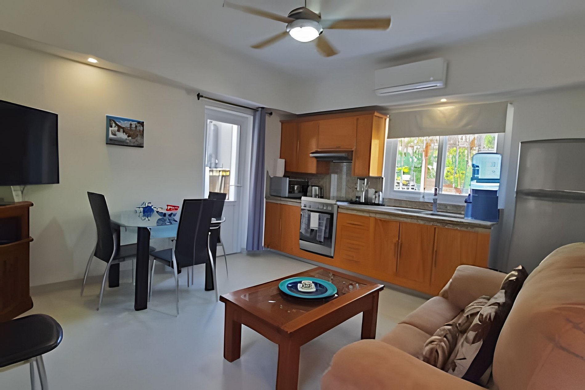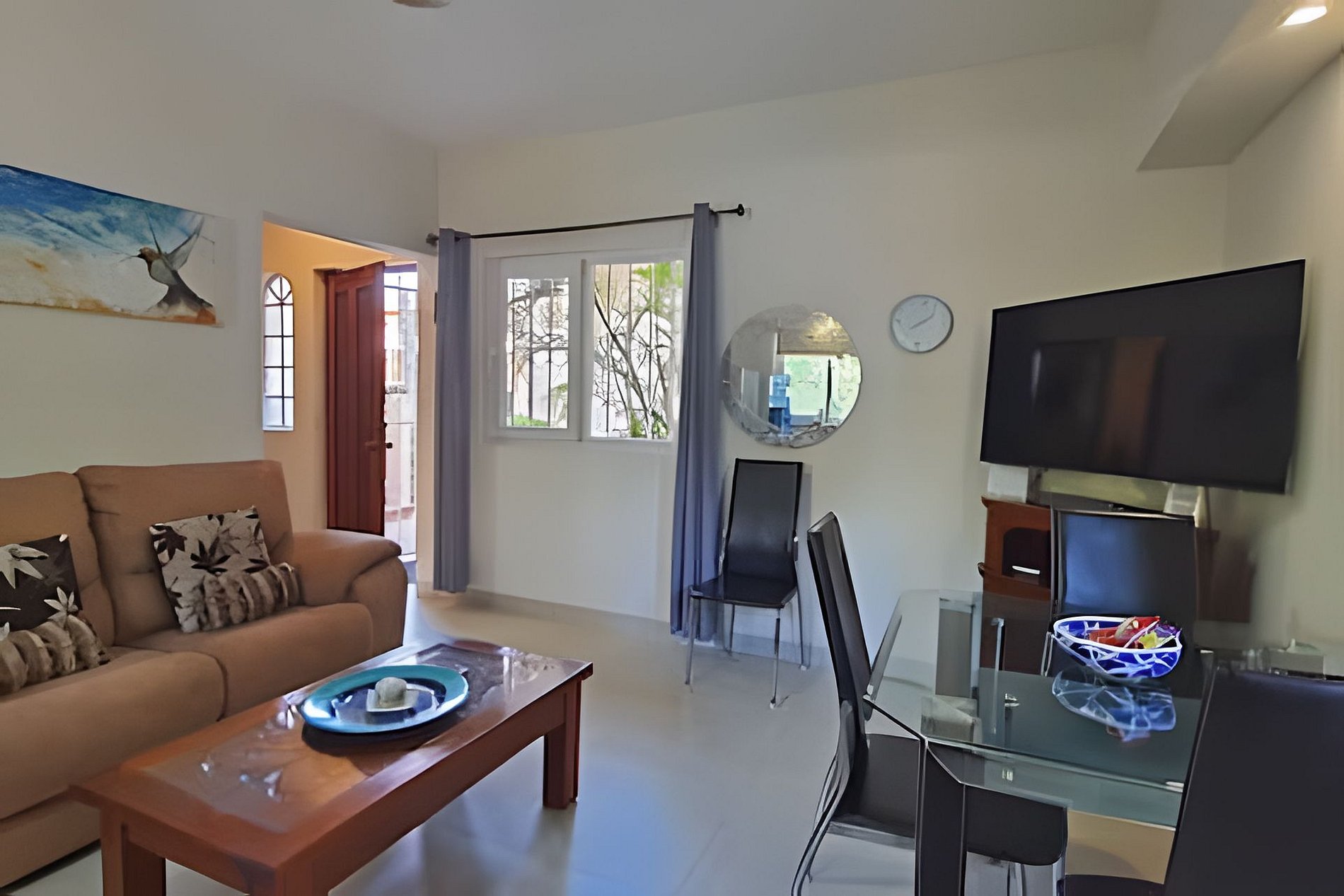 Beautiful one bedroom apartment on first floor with all the comfort, good lighting and excellent location, couple of blocks from the beach, near to down town, restaurants, grocery stores, hospital, banks and public transportation. It has a king size bed, A/C, equipped kitchen with refrigerator,stove/oven, microwave, coffee maker, toaster, pans, etc. Private bathroom, plasma TV by cable, Wi-Fi, cleaning service, common laundry facilities washer/dryer, and patio with pool, palapa, BBQ, etc.