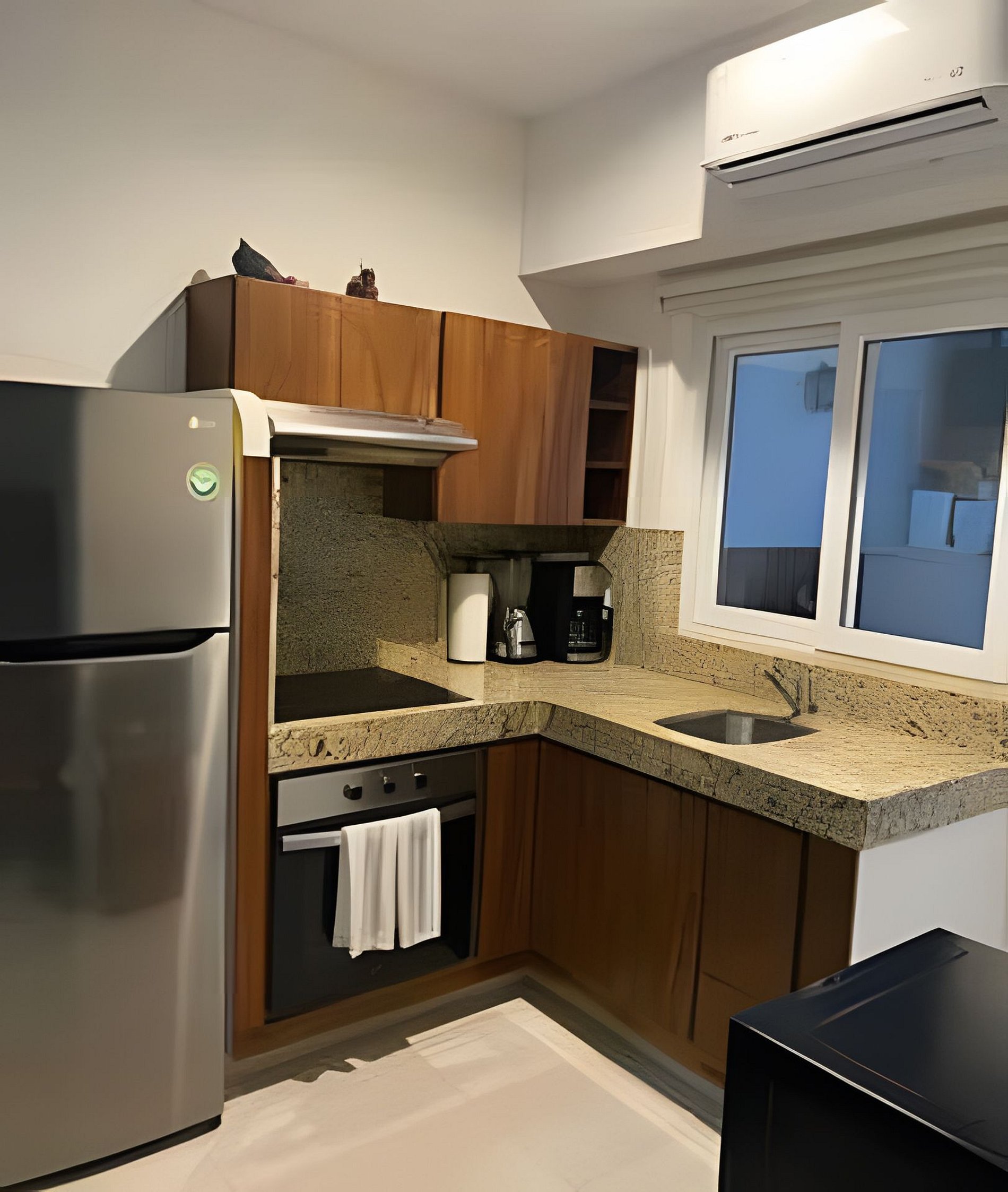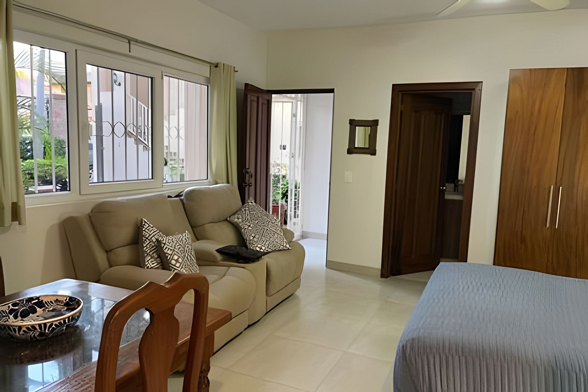 Estudio con todas las comodidades, buena iluminación y excelente ubicación, a un par de cuadras de la playa, cerca del centro, restaurantes, tiendas de abarrotes, hospital, bancos y transporte público. Habitación en planta baja, cuenta con una cama queen size, A/C, cocineta equipada con refrigerador,estufa/horno, microondas, cafetera, tostadora, sartenes.. Baño privado, TV plasma por cable, Wi-Fi, servicio de limpieza, lavandería común lavadora/secadora, y patio con alberca, palapa, asador, etc.