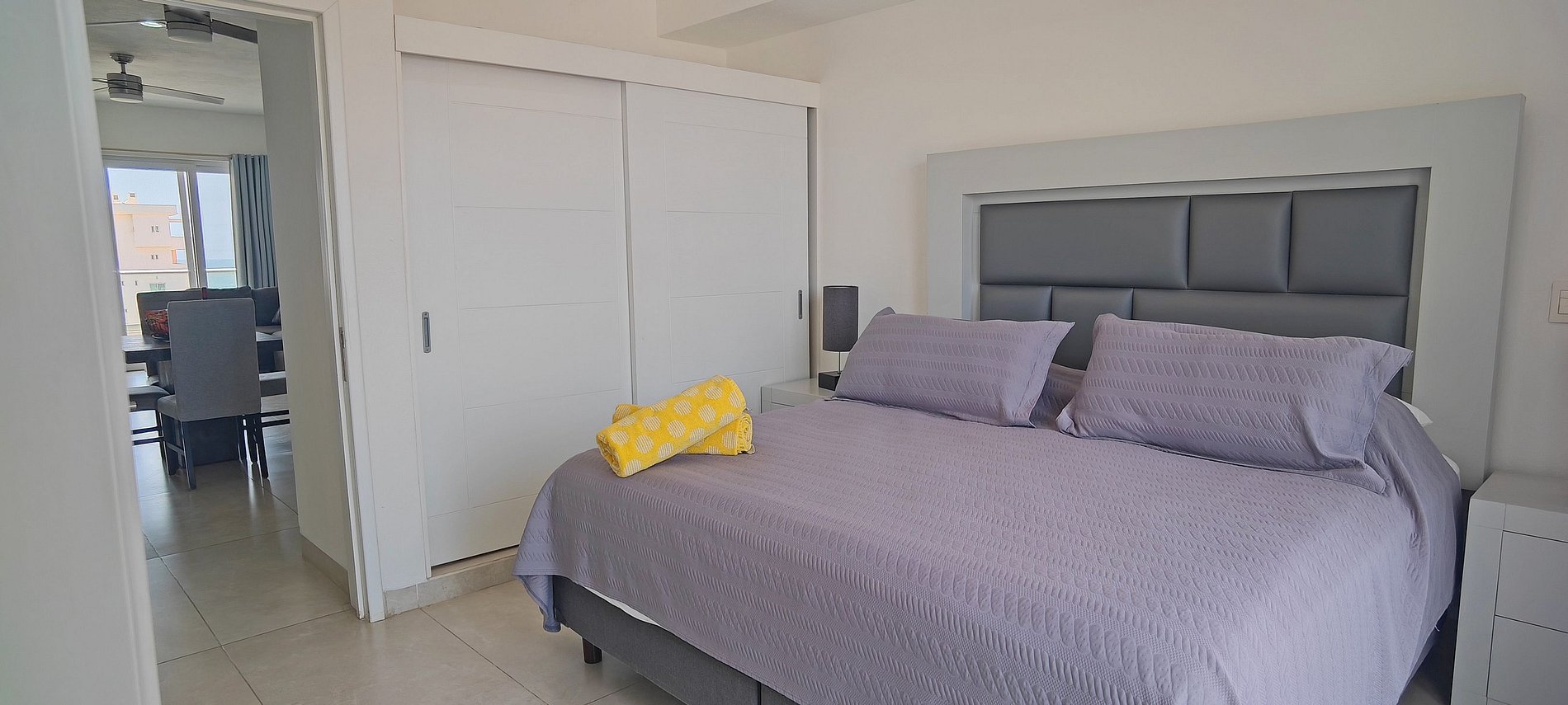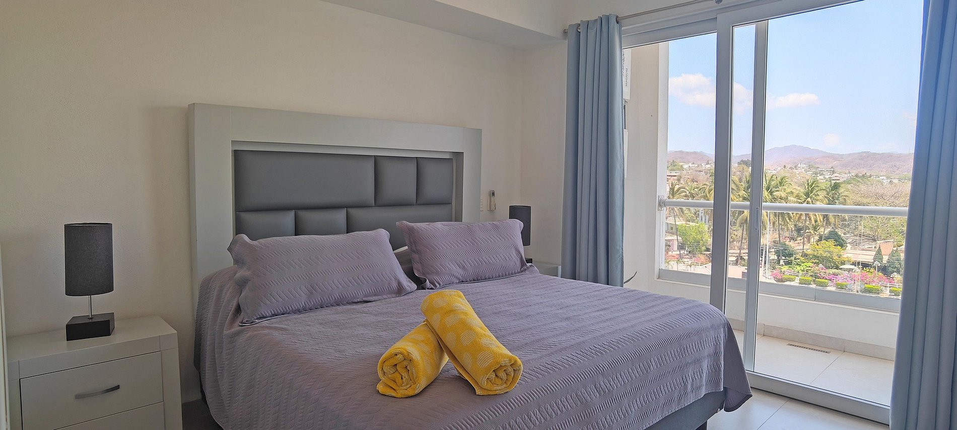 Acogedor departamento de una recámara con cama King Size, cocina completa, comedor, baño y medio, clóset, cuarto de lavado con lava-secadora, dos balcones, uno con vistas a la alberca y el otro con vistas a la calle.