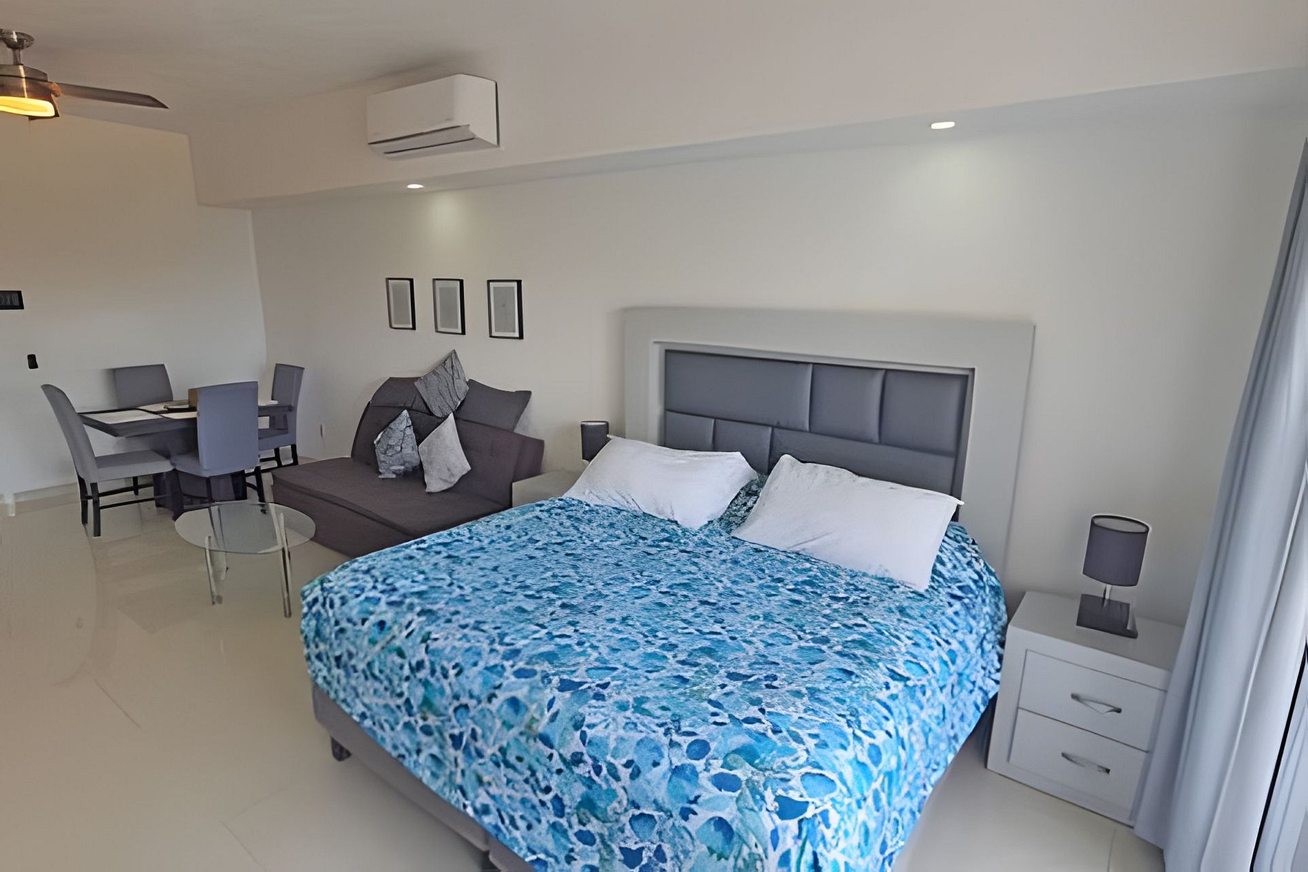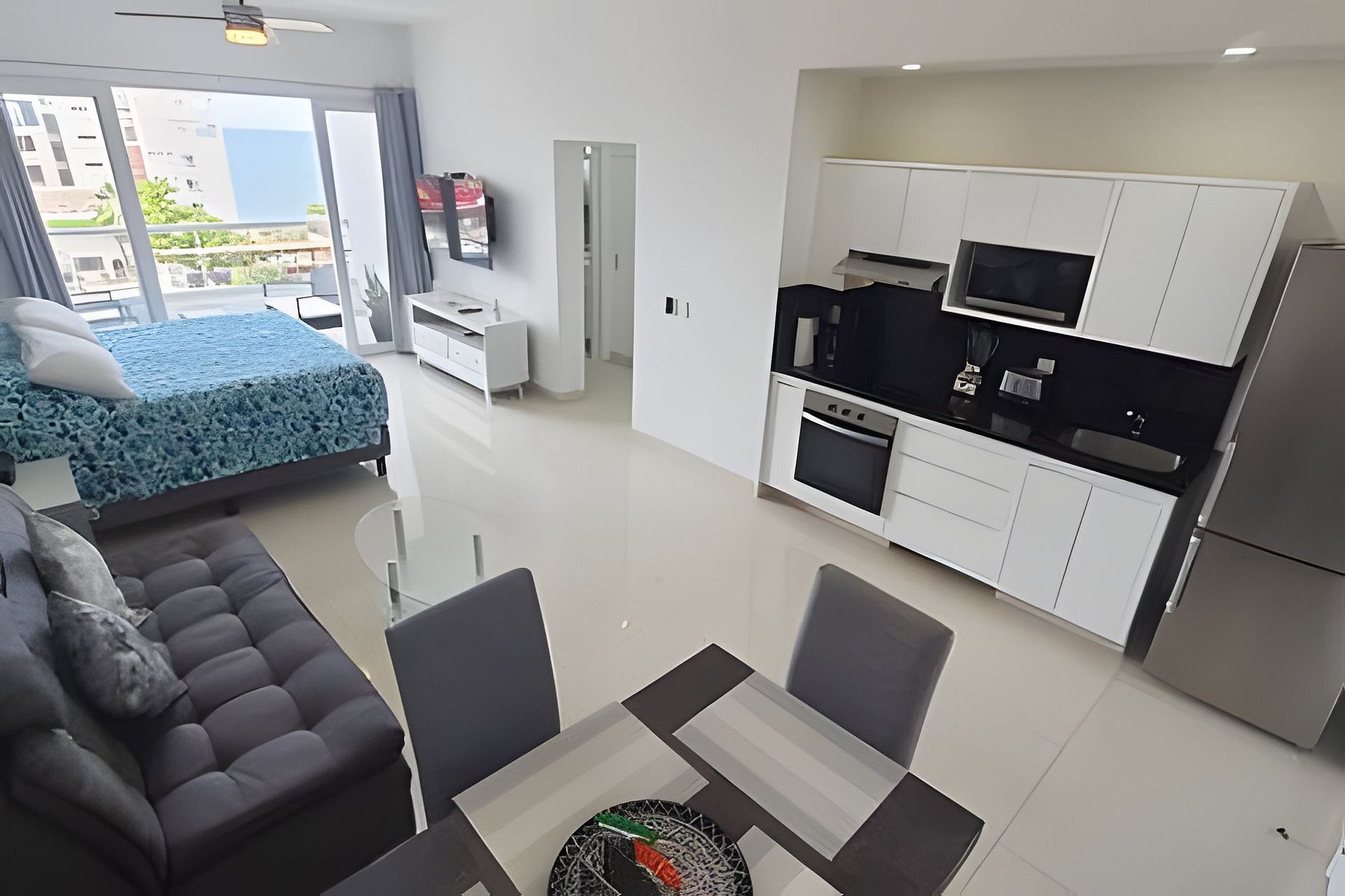 Acogedor estudio con una cama King Size, un sofá cama, cocina de tamaño completo, comedor, un baño completo, clóset, cuarto de lavado con lava-secadora, y balcón con vistas a la playa.