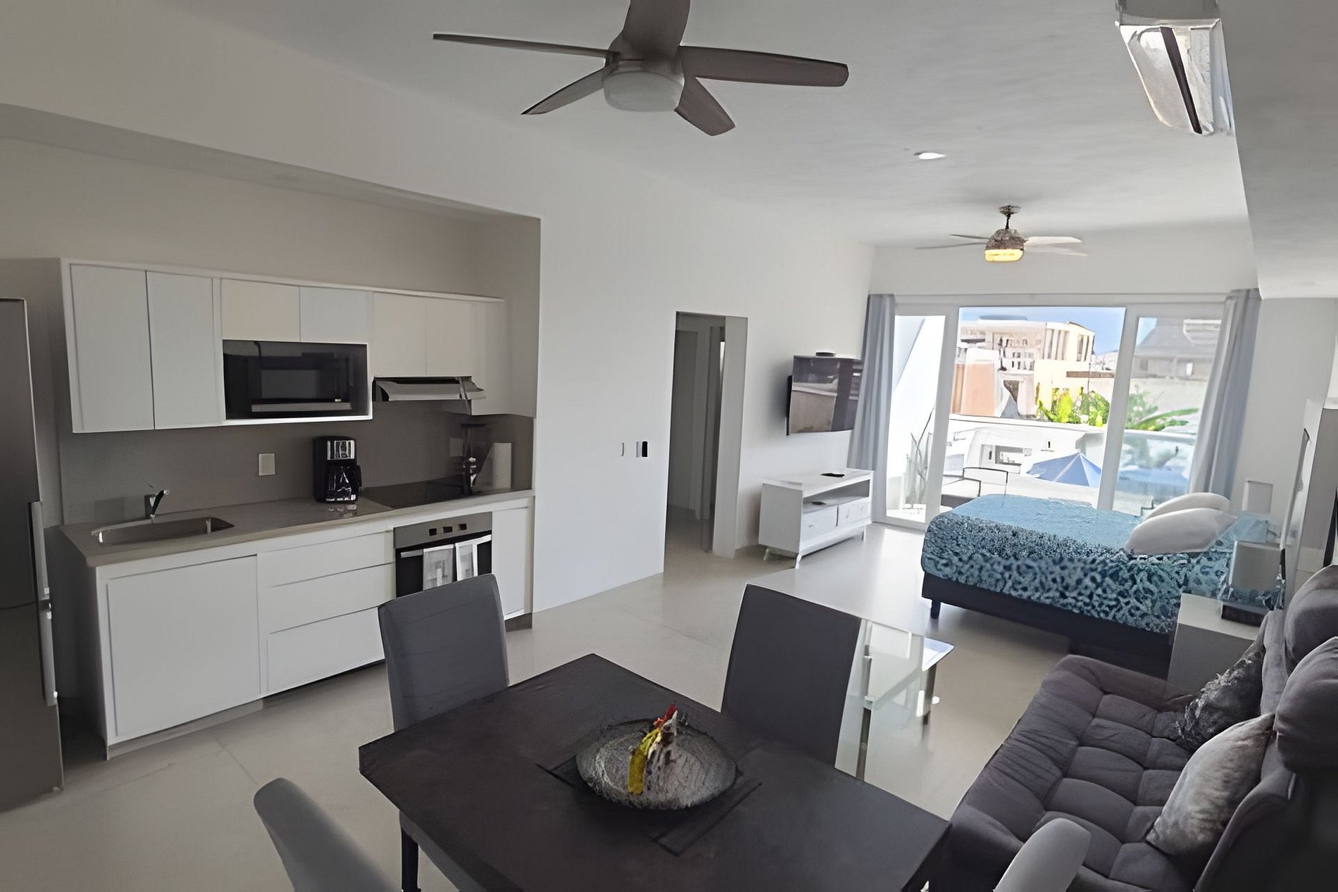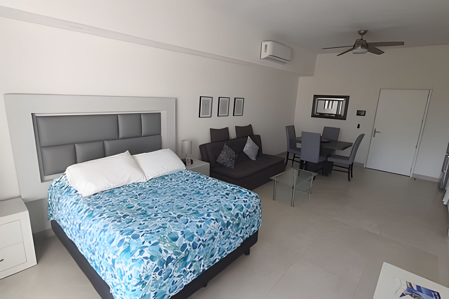 Acogedor estudio con una cama Queen Size, un sofá cama, cocina de tamaño completo, comedor, un baño completo, clóset, cuarto de lavado con lava-secadora, y balcón con vistas a la alberca.