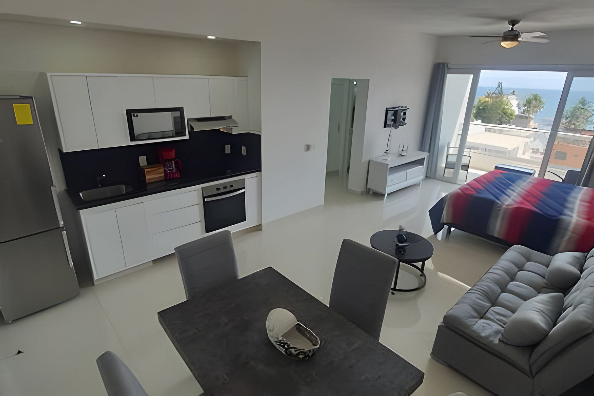 Acogedor estudio con una cama King Size, un sofá cama, cocina de tamaño completo, comedor, un baño completo, clóset, cuarto de lavado con lava-secadora, y balcón con vistas a la playa.